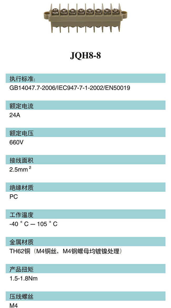 JQH8系列繼電保護(hù)端子,是為國(guó)內(nèi)外繼電保護(hù)裝置而開(kāi)發(fā)的電流端子;主要應(yīng)用于各類(lèi)電力,電子,儀器裝置、繼電保護(hù)裝置等機(jī)箱穿墻類(lèi)型電路進(jìn)出線連接,適用導(dǎo)線2.5mm2,其設(shè)計(jì)合理,結(jié)構(gòu)緊湊,接線直觀可靠,使用方便,端子絕緣材料采用高性能PC工程塑料,阻燃達(dá)到UL94-V0級(jí),電氣機(jī)械性能良好,導(dǎo)電體和組合螺釘標(biāo)配銅合金螺釘,能確保產(chǎn)品保持有效的氣密度,低阻值,永久性連接,保證接線的可靠。被廣大工程師選用;有多種規(guī)格可供選擇,還可根據(jù)客戶(hù)要求開(kāi)發(fā)相應(yīng)的回路端子。(JQH8-8P、JQH8-10P 、JQH8-12P、JQH8-16P)等。