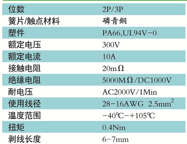 接線端子的絕緣材料用改性的尼龍(PA66),能達到或超過IEC947-7-1EN60947-7-1標準,阻燃等級達到UL94V-0具有良好的電氣性能和機械性能。螺絲用高強度的鋼制成鍍鋅或鎳處理,導電體四方針用合金銅制成表面鍍錫,壓片采用彈性及極強的磷青銅表面鍍錫或鎳;壓線框用抗應力裂縫腐蝕的合金銅制成,這些金屬表面還鍍錫或鍍鎳加以保護。設計完全符合IEC60947-7-1.GB14048.7等標準。